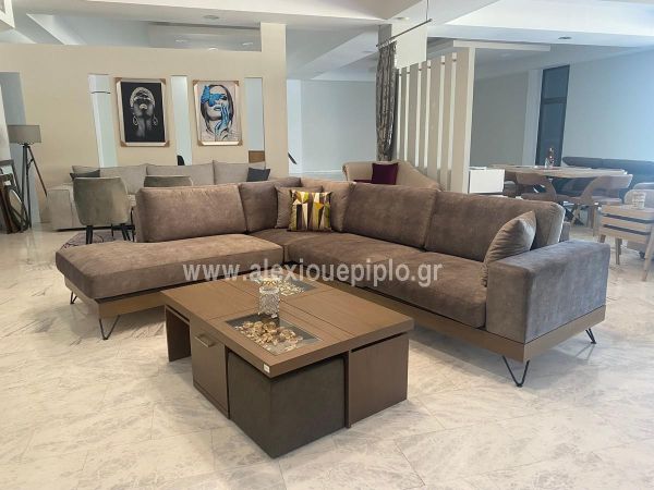 Σαλόνι γωνία με σύγχρονο και μοντέρνο σχεδιασμό που θα ταιριάξει στο καθιστικό σας προσφέροντας στυλ στο χώρο σας,είναι ιδανικός για να απολαμβάνετε στιγμές χαλάρωσης.Τα μεταλλικά ποδαράκια και η ξύλινη μπάζα, δίνουν έναν αέρα μοντέρνου design.Έχετε τη δυνατότητα να επιλέξετε το χρώμα του ξύλου και του υφάσματος που ταιριάζει στον χώρο σας, όπως επίσης και να αλλάξετε τις διαστάσεις σε αυτές που επιθυμείτε.